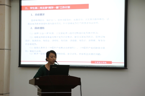 会上,艺术设计学院党总支副书记吕宁进行了主题发言,分别从部署方案、领导带头、支部活动、党员学习、工作推进几方面详细总结了上半年学院在“两学一做”学习教育工作中的经验和做法,为更好地开展下一阶段的各项工作打下了坚实基础。教工第一党支部书记康慧和学生第二党支部书记朱瑞华分别进行交流发言。