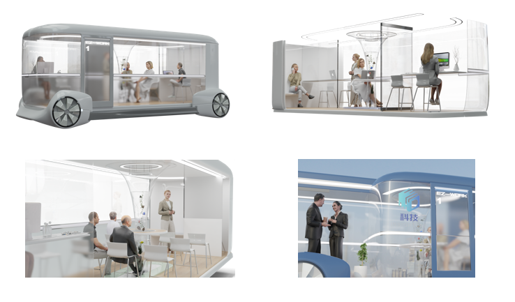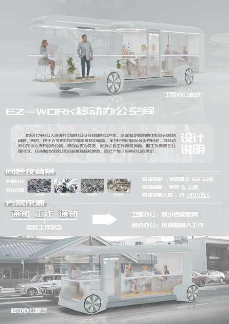 此次我校入选的“EZ-WORK移动办公空间”作品,由艺术设计学院院长高瞩教授团队设计。本设计聚焦办公人员进行卫星办公以及移动办公,解决城市病中职住分离的问题,同时,由于大城市中写字楼租赁费用颇高,不利于初创团队及用户创业,将移动办公车作为流动的办公楼,使创业更为灵活。此外许多工作需要外勤,而工作需要在公司完成,从外勤地点到公司的路程往往被浪费,因此产生了车内办公的需求。同时产品具有载运移动办公空间、城市卫星区协同办公、车内办公空间模块化、车群协同系统等创新点。