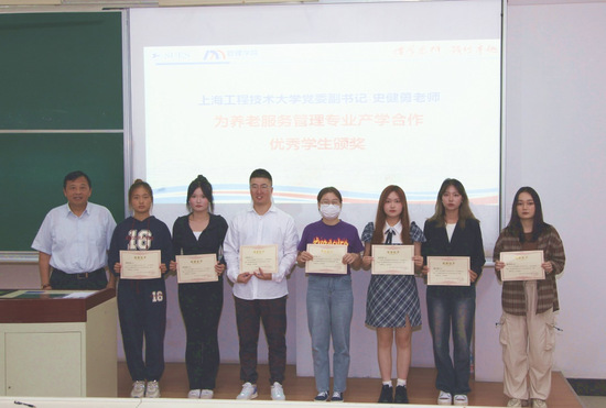 校党委副书记史健勇老师为产学合作优秀学生颁奖。史健勇老师亲切地将养老服务管理专业第一届学生称为黄浦一期,“今天我们已经有黄浦四期了!”,对同学们在专业实践中的体悟表示赞赏。史健勇老师提出,专业教师团队将共同努力,帮助同学们打造好自己的职业规划,朝着养老机构的职业经理人、社区养老规划师、个人养老咨询顾问的目标不断迈进。史健勇老师对专业同学们寄予厚望,期待大家未来在养老领域真真切切帮助到老龄群体。