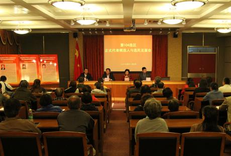 11月9日,虹口区第十六届人民代表大会104选区正式候选人与选民代表见面会在高职学院综合楼九楼第二报告厅举行。高职学院党委领导、江湾镇纪念居委党政负责人及104选区的选民小组成员和部分选民代表等参加了会议。会议由高职学院党委书记、第104选区选举工作组组长柳如荣同志主持。