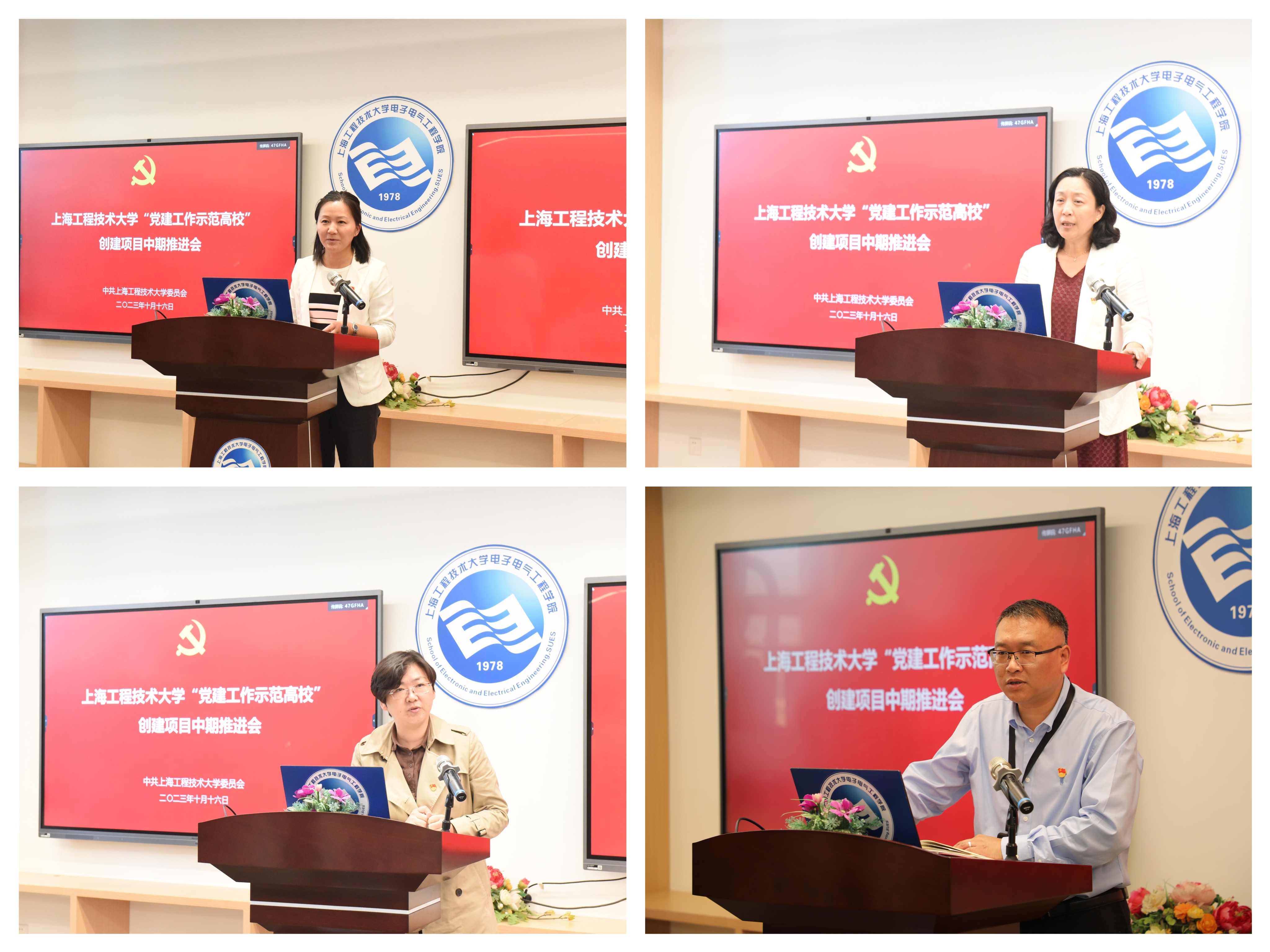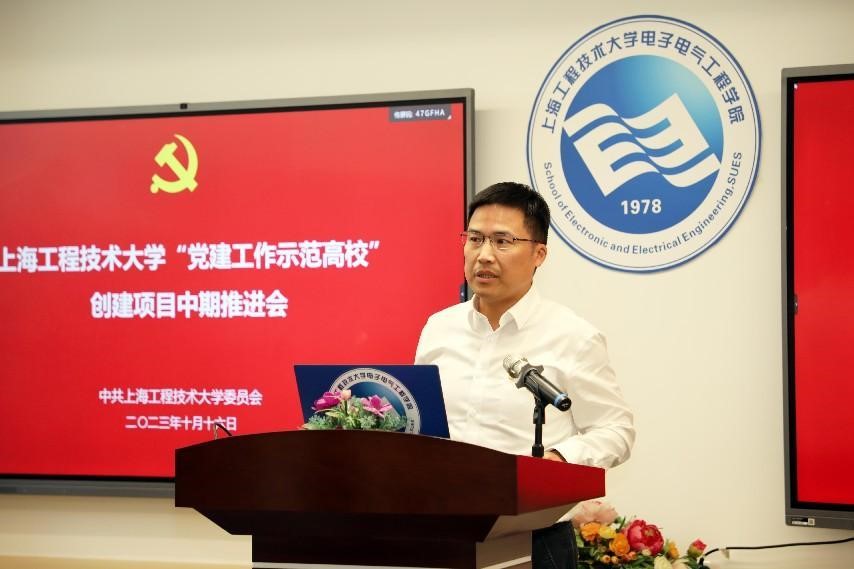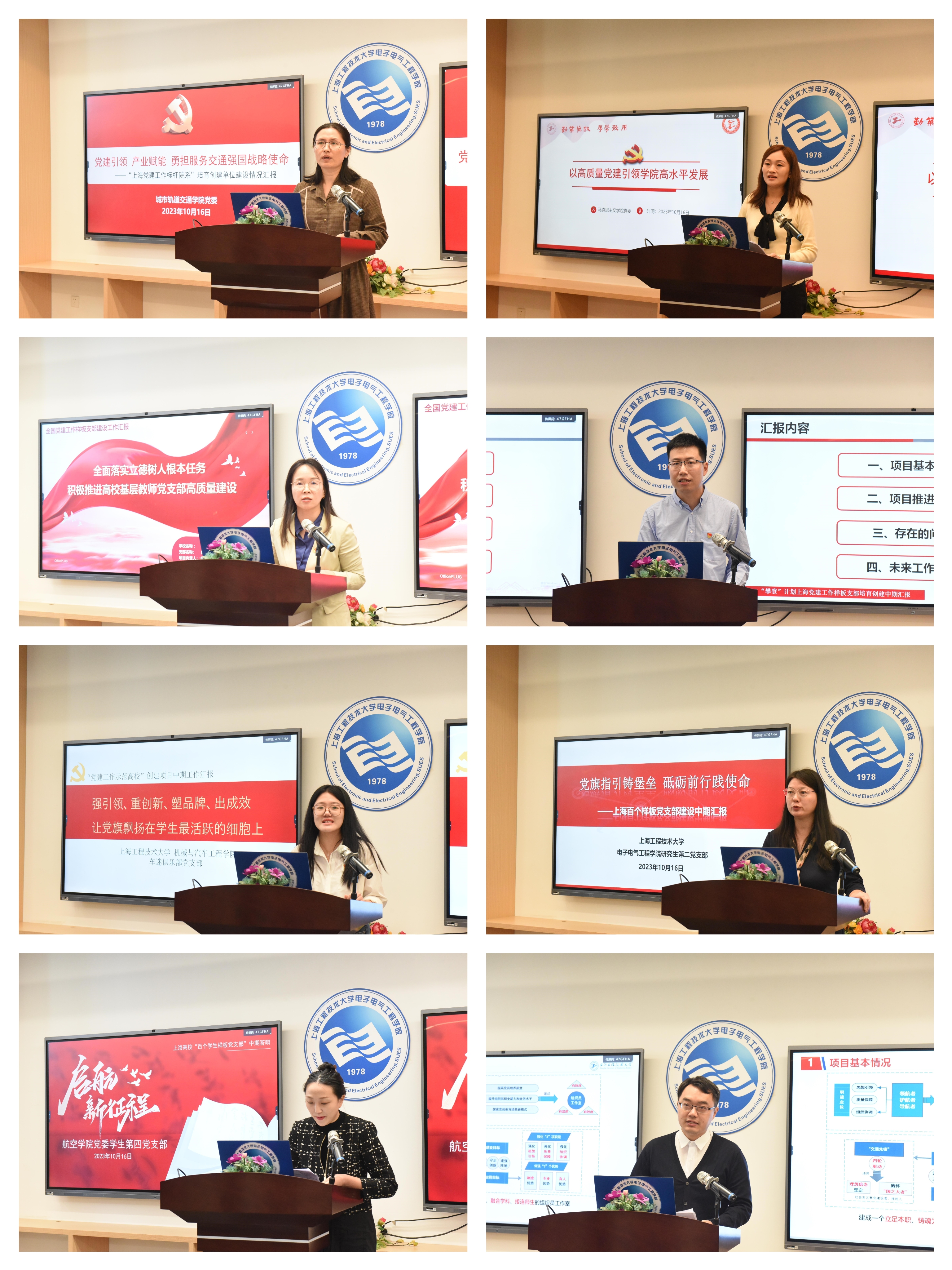 本次中期推进会由“全国党建工作样板支部——航空运输学院教工第三党支部”等8个创建项目作中期建设情况汇报。上海党建工作标杆院系——城市轨道交通学院党委以《党建引领 产业赋能 勇担服务交通强国战略使命》为题,学校“党建工作标杆院系”——马克思主义学院党委以《以高质量党建引领学院高水平发展》为题,全国党建工作样板支部——航空运输学院教工第三党支部以《全面落实立德树人根本任务 积极推进高校基层教师党支部高质量建设》为题,上海党建工作样板支部——化学化工学院环境工程专业教工党支部以《踔厉奋发勇争先,笃行不怠谱新篇》为题,上海高校“百个学生样板党支部”——机械与汽车工程学院车迷俱乐部党支部以《强引领、重创新、塑品牌、出成效 让党旗飘扬在学生最活跃的细胞上》为题,上海高校“百个学生样板党支部”——电子电气工程学院研究生第二党支部以《党旗指引铸堡垒 砥砺前行践使命》为题,上海高校“百个学生样板党支部”——航空运输学院学生第四党支部以《启航新征程》为题,上海教卫系统首批“组织员工作室”——“交通先锋”组织员工作室以《坚持“深耕主业、守正创新、建强阵地”,增强基层党建活力》为题进行了汇报。