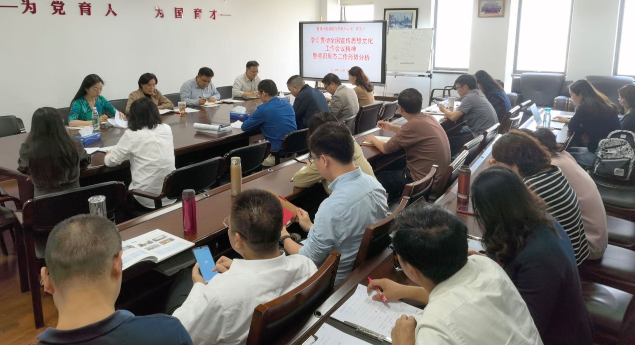 深入学习贯彻全国宣传思想文化工作会议精神,以习近平文化思想为指导,一体推进宣传思想教育工作、意识形态工作等。10月17日,数理外国语联合党委举办理论学习中心组(扩大)学习会,进行深入学习和交流,强化对会议精神的理解,统一思想,对学院宣传思想文化工作进一步分析部署。联合党委中心组全体成员、学院系部主任副主任、支部书记参加学习,城市轨道交通学院石嵘老师列席旁听。