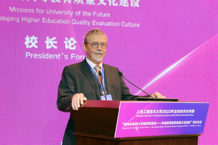 Lutz Herfurth校长以“面向未来的学习和科研”为题,介绍了德国的高等教育体系和北豪森大学的历史沿革及特色优势,强调了科研和创新在高等教育中的重要性,以及北豪森大学在这一领域的突出成就。他呼吁各国校长深化科研合作,共同推动科技创新。