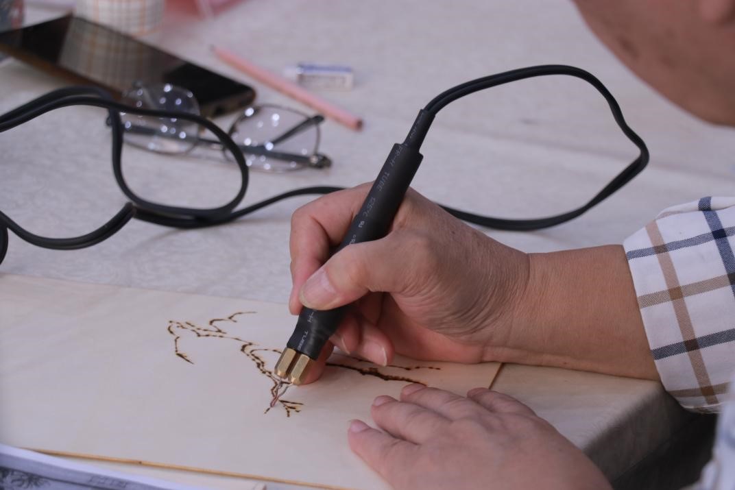 年近古稀的徐成荣仍然活跃在文化的第一线,专注烙画创作,首创“烙笔淡彩画”,多次被上海松江佘山镇评为“能工巧匠”“十佳全能”称号。在他的努力下,烙画技艺被越来越多的人所熟知。活动中,徐成荣老师向大家分享了自己从事烙画艺术的经历,通过生动的小故事引出了烙画的起源,讲解了烙画制作常用的工具,绘画手法以及创作心得,并现场演示了烙画绘制的技法与过程。
