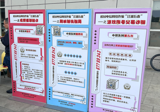 为了提高同学们的防诈意识,加大校园防诈骗宣传力度,增强师生的法治观念和安全防范意识,10月25日中午,保卫处协同大学城派出所,带领校平安志愿者在第一食堂门口开展了“识诈反诈”闯关活动。