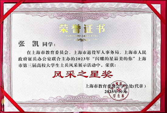 10月25日,由上海市教委、上海市征兵办和上海市退役军人事务局主办的“闪耀的星 最美的你”上海市第三届退役大学生士兵风采展示颁奖典礼在东方绿舟举行,电子电气工程学院控制科学与工程专业20级研究生张凯荣获“风采之星”称号。