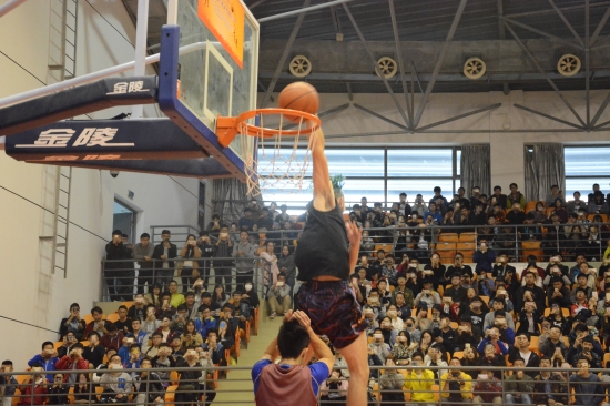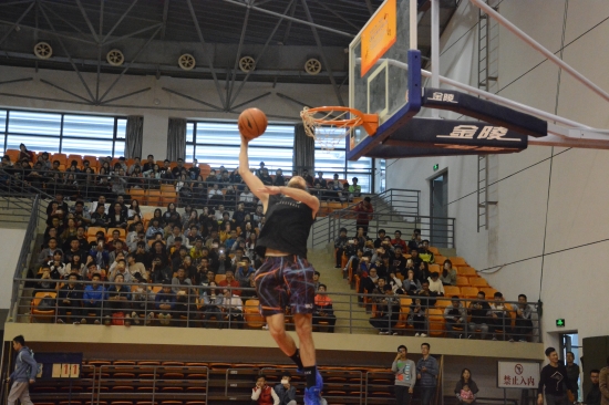之后我校篮球队员在轻松愉悦的氛围下也上场与白乔丹进行了扣篮交流,我校队员的精彩扣篮动作也赢得了全场观众的阵阵掌声。