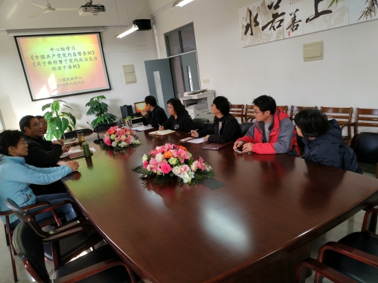 工程实训中心党总支于11月15日在实训1号楼1438会议室召开中心组学习,学习讨论《关于新形势下党内政治生活的若干准则》和《中国共产党党内监督条例》,实训中心总支书记胡义刚、实训中心主任徐新成、副主任余粟、副主任朱建军及全体中心组成员参加了学习。中心组学习由实训中心党总支书记胡义刚老师主持。