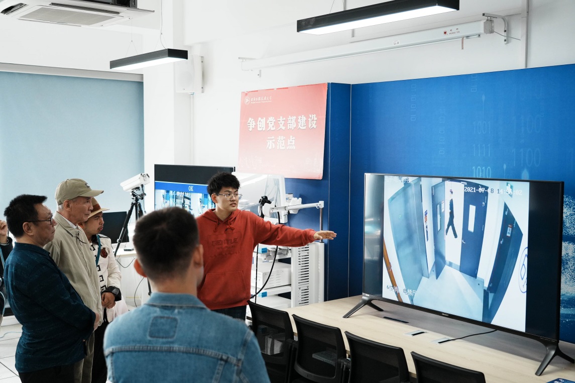 在5G+人工智能应用联合创新实验室,学生志愿者从实验室历史、人工智能产业研究院架构、研发团队、各种核心技术和实际场景应用等方面为校友进行了讲解。
