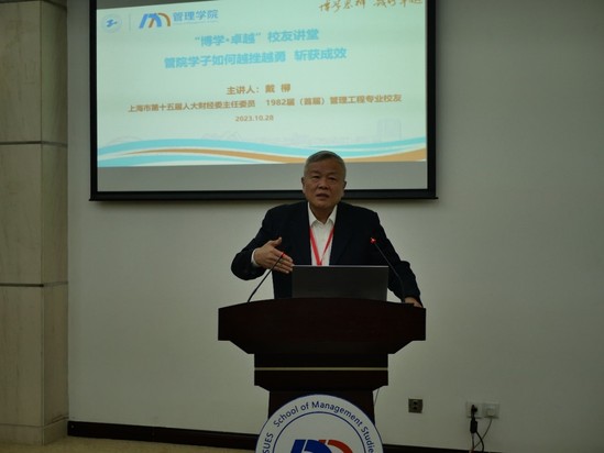 共话成长,共谋发展——校友讲堂,由管理学院党委书记周洁主持,邀请的嘉宾为我院1982届(首届)管理工程专业校友、上海市第十五届人大财经委主任委员戴柳。戴柳校友有着丰富的工作经历,并取得了非常卓越的成绩,他从自己的五个经历阐述如何面对挫折,认为要从事故中来面对挫折,并从个人案例来阐述,最后总结出了学习能力、实践能力、个人坚持能力、融会贯通和团队合作能力这5个宝贵的能力。