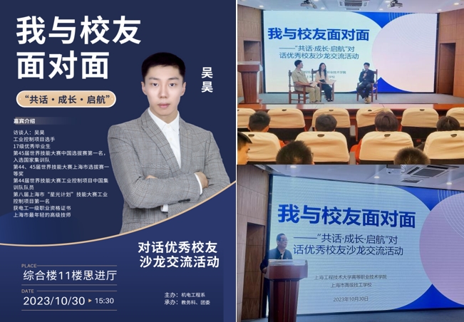 作为建校45周年系列活动之一,为让在校学子们近距离对话优秀校友,感悟工匠精神,高职学院在10月30日下午举办了以“共话·成长·启航”为主题的对话优秀校友沙龙交流活动。活动特邀学院机电工程系2019届优秀毕业生吴昊担任访谈嘉宾,吴昊入学时的招就办主任、现学院校关工委委员杨培成老师作为发言嘉宾参加活动。活动吸引了一百余名学生参与沙龙访谈和互动交流。