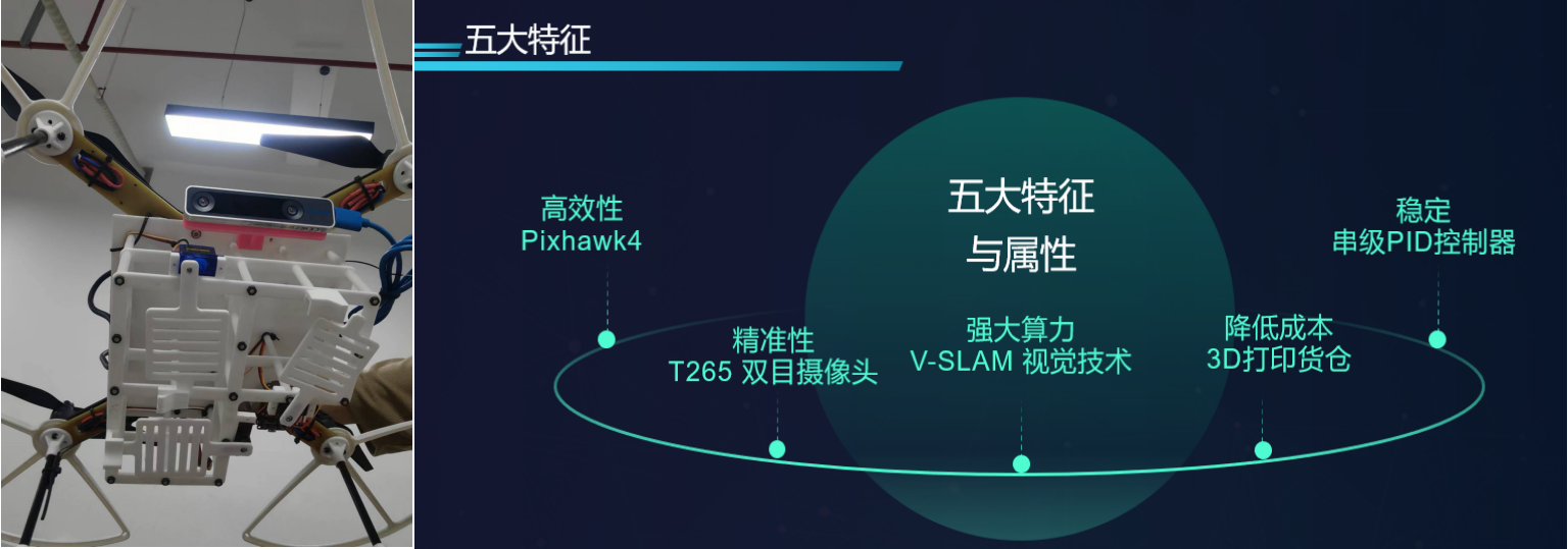 项目在利用已有的基于GPS信号的定位方法基础上,融合了超宽带无线感知定位技术对超宽带无线感知基站的位置进行纠偏,选取双目视觉摄像头进行图像目标分析和识别,设计并实现一种智能无人机物流配送系统,在部分地区做市场推广。