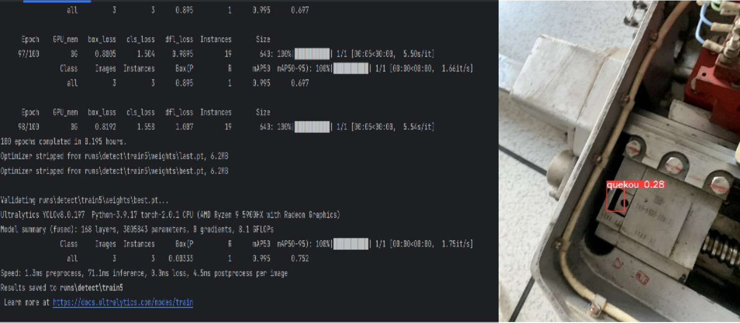 项目选用YOLOv8模型进行图像的深度学习,提高了转辙机缺口检测系统的精确度;基于人工智能传输系统,解决了外部环境对转辙机缺口检测的影响,抗干扰性更强;基于监测的数据可以存储于数据库中的方式,解决了转辙机缺口数据丢失的问题,达到了通过数学分析手段预判转撤机状态的效果。