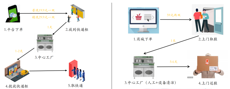 项目聚焦喜欢科技便利的年轻人群,以及时和无损洗烘为特色,基于APP(平台),利用快递柜与清洁设备,再加上人工服务,为用户提供便捷、舒适的智能共享洗鞋服务。