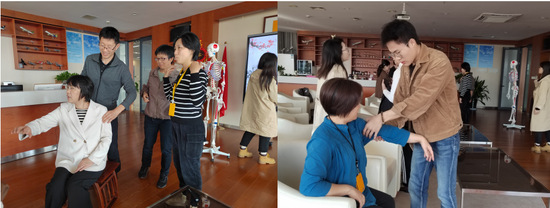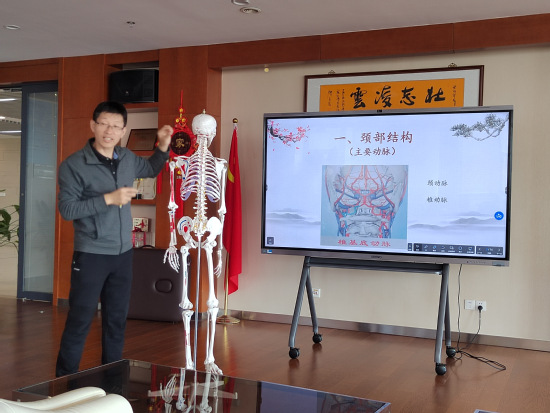 武老师借助教具和PPT,为大家耐心讲解了头部、颈部、肩部的穴位和肌肉等,对常见颈肩腰椎病产生的原因、发病的现象进行了系统、详细的讲解,并为大家演示了舒缓头部、肩颈部不适的按摩手法。通过武老师的介绍和示范,大家了解到头、颈、肩部重要的穴位, 也切身体会到有针对性地推拿按摩可以促进局部血液循环,从而缓解颈部疼痛、僵硬等不适症状,甚至治愈一些常见病。武老师还介绍了他精心设计的“醒脑增视操”,并为有肩颈腰痛的老师进行解疑答惑、现场示范教学推拿按摩操作要领。
