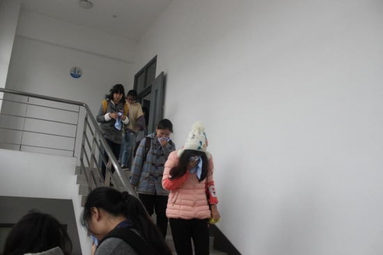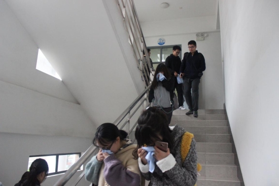 中午,副组长陶祖耀老师下达了逃生演练开始的命令,随即2个班的学生分别由班长有序带出机房并按指定路线从通道2侧楼梯进行疏散。疏散过程中师生按照要求用毛巾捂住口鼻,弯腰俯身行走并在引导员的正确指挥下迅速、有序地从消防楼梯疏散至室外指定集合地点。