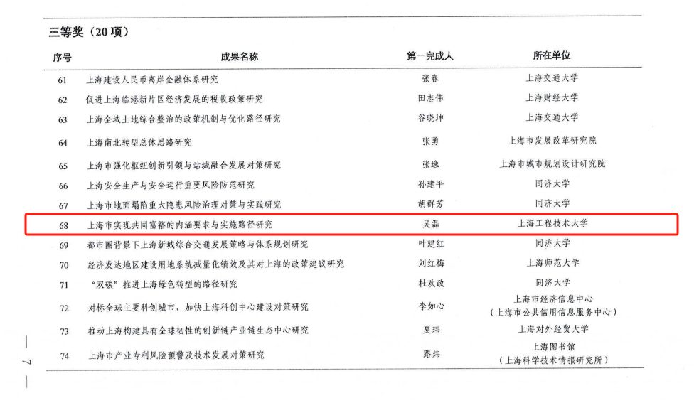 管理学院吴磊教授主持的上海市政府决策咨询重点课题结项成果《上海实现共同富裕的内涵要求与实施路径》,立足上海市实现共同富裕已有实践,在系统梳理国内省市共同富裕实践做法与经验基础上,对上海实现共同富裕的独特内涵进行了分析,对上海市实现共同富裕的基础条件和优劣势进行了阐释与总结,并构建出一套共同富裕评价指标体系,进一步提出推动上海市实现共同富裕的重点任务与具体举措,课题专报被上海市政府发展研究中心成果录用或被教育部采纳。该课题研究报告获得第十四届上海市决策咨询研究成果奖三等奖。