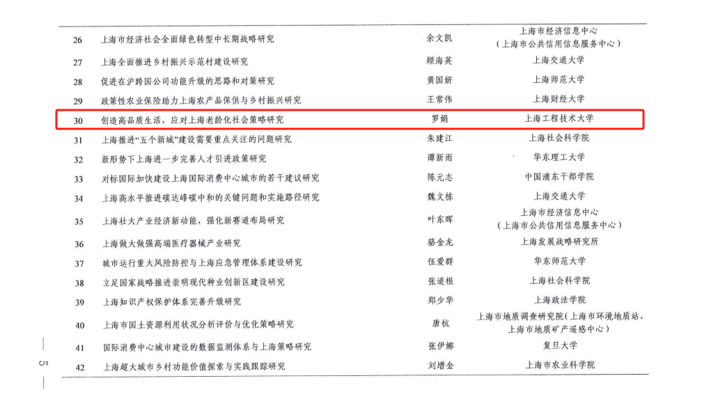 管理学院罗娟副教授主持的研究课题《创造高品质生活,应对老龄化社会对策研究》围绕“健康老龄化”的概念,通过社会调研深入了解上海老年人养老服务的现实需求,在此基础上,构建上海创造老龄化社会高品质生活的指标体系并进行评估,明确五大重点领域并得出优化高品质生活的实施路径,在国内外经验借鉴的基础上总结出“五精”体系,提出创造高品质生活、应对老龄化社会的对策建议,课题专报获得时任上海市市长、副市长等领导批示。该课题研究报告获得第十四届上海市决策咨询研究成果奖二等奖。