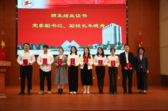朱晓青为岗前培训优秀青年教师代表颁发结业证书并合影。