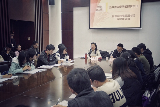 12月2日下午,管理学院团校培训第三课在图文信息中心第五报告厅开讲。管理学院党委副书记范君晖老师、分团委书记吉祥老师参加了会议,此次培训对象包括2016年青年团校学员及学院主要团学干部等70余人。本次课程由吉祥老师主持,范君晖老师作为主讲人,以“当今青年学子的时代责任”为主题。
