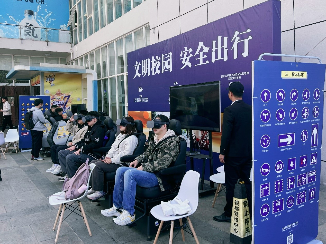 现场,同学们体验了4D座椅和VR驾驶模拟器,可还原车祸现场真实体验,通过丰富的真实案例沉浸式重现,将“知危险、畏生命”的种子种在学习驾照之初,将安全文明驾驶的观念深刻烙印在之后的驾驶行为中,从而助力降低交通事故的发生。