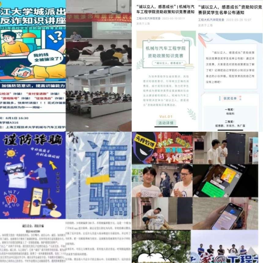 在这一年中,机械与汽车工程学院承办学校“感恩立心,诚信立行”诚信主题活动,组织协调各学院积极开展各项活动,引导学生将诚信理念入脑、入心、入行,进一步落实资助育人工作对当代大学生感恩意识、诚信意识、风险意识的浸润作用。通过主题班会、专家讲座、知识竞赛、网络短剧、征文比赛、海报设计、电影赏析等多种形式将诚信教育融入班级、校园文化建设中,着力拓宽线上媒介、微信群、网络直播等多种宣传渠道,为学生营造“弘扬诚信,从我做起”的校园文化氛围。活动期间,学院通过举办“诚以立人,感恩成长”资助知识竞赛及防诈小视频创作活动,宣传资助政策,普及征信知识,树立学生的诚信观念和契约精神,切实增强学生法律意识及反诈骗能力。