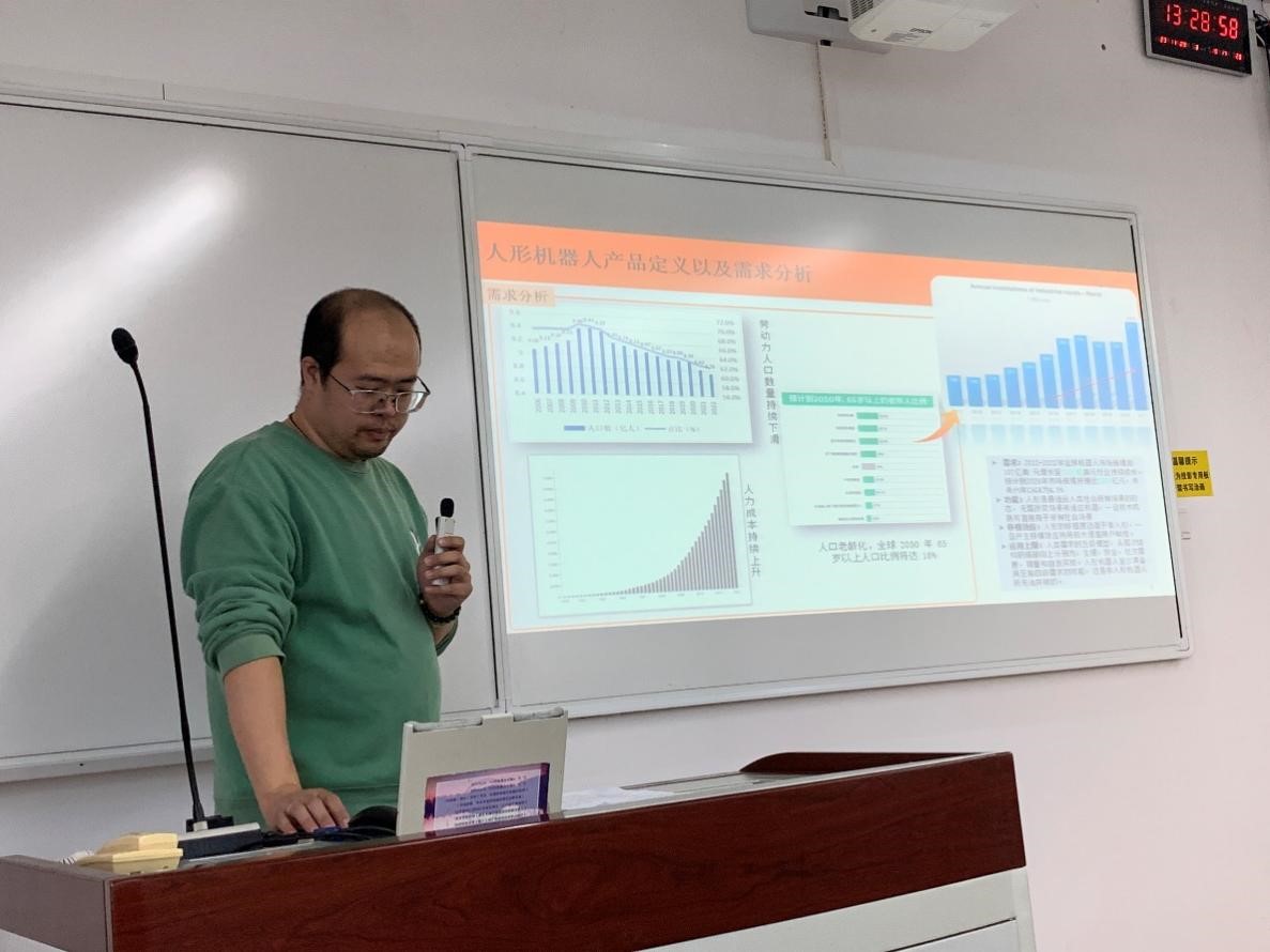 本次授课的主题为“国内外人形机器人产品梳理与发展趋势”,主要内容包括:人形机器人产品定义以及需求分析,国内外双足人形机器人研发情况分析以及人形机器人行业前景分析。王奉文工程师具有多年机器人研发经验,曾在多家国内著名研究所和企业从事过设计研发工作。他在本次授课过程中全面介绍了人形机器人产品在国内外的发展现状和未来趋势,引发了学生们浓厚的兴趣和思考,为学生们打开了一扇了解人形机器人产业的窗口。