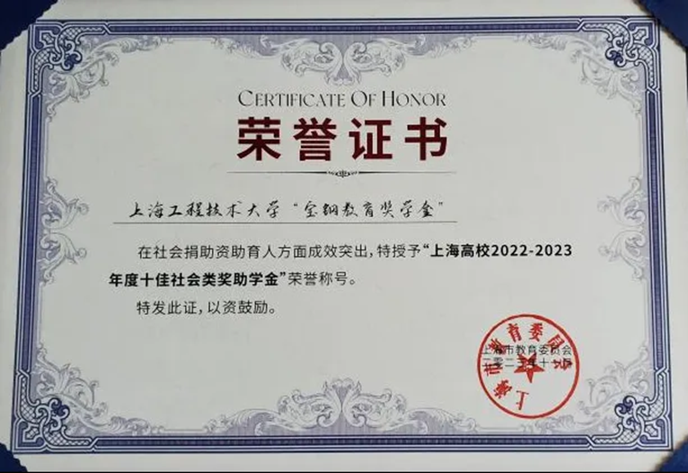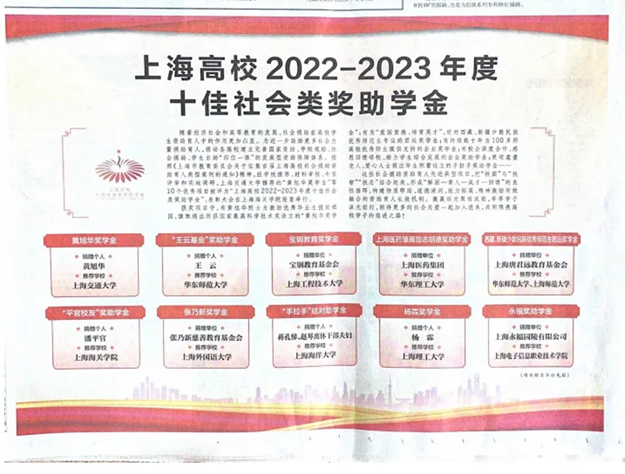 此外,我校推荐的“宝钢教育奖学金”荣获“上海高校2022-2023年度十佳社会类奖助学金”荣誉称号。宝钢教育奖学金自设立以来,为贯彻“科教兴国”和“人才强国”战略,以“奖掖优秀人才,力行尊师重教,推动产学合作,支持教育发展”为宗旨,是全国最具知名度的教育奖项之一。截至2022年,共计全国120余所高等院校的26875名师生荣获了宝钢教育奖,用于教育奖励和资助金额累计2.7亿余元。