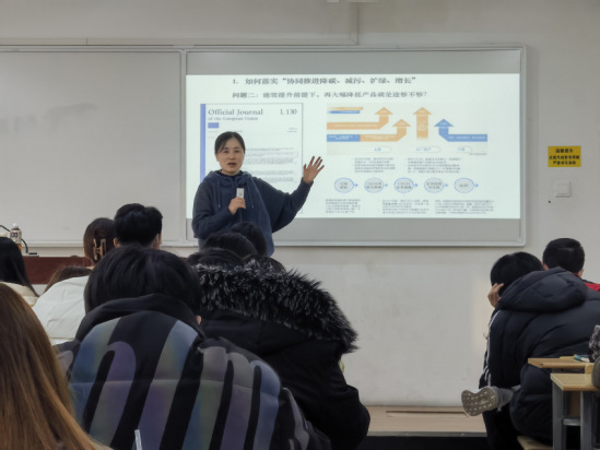 胡静主任讲座围绕如何理解与如何落实“协同推进降碳、减污、扩绿、增长”展开。她结合国家发展战略和团队实践经验向同学们介绍了当前我国环境政策研究面临的新挑战和机遇。对党的二十大报告中提出的推动绿色发展,促进人与自然和谐共生的新发展要求、习近平总书记在全国生态环境保护大会上的重要讲话精神以及“十四五“节能目标责任评价考核工作方案进行了解读。梳理了欧盟碳边境调节机制和《电池与废电池法》的核心要素,并结合《高耗能行业重点领域节能降碳改造升级实施指南》和国家发改委等部门的指导意见分析了我国相关行业面临的压力和对策。胡主任指出,我国需要加快完善碳交易市场建设,积极参与国际碳定价规则制定,提升气候治理话语权。她勉励在座的每一位同学视自己的专业为一种“崇高的职业”,负重前行,奋发进取,为国家的“双碳”战略做出贡献。