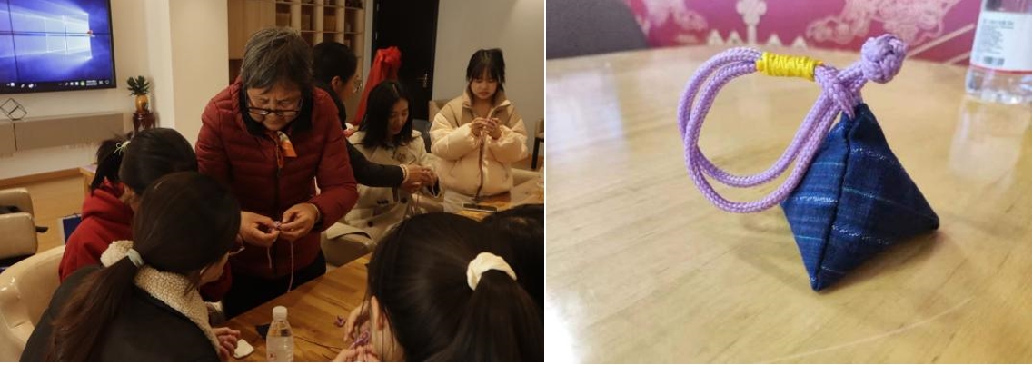 最后,纺织服装学院的师生们现场体验传统文化手工制品粽子型香囊的制作。在朱定村年迈手艺人的悉心指导下,师生们认真学习,在绳结编织、一针一线中感受着传统文化的魅力,加深对传统文化的了解。