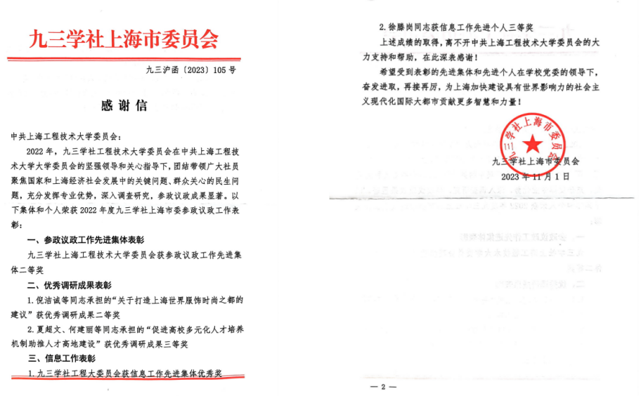 九三学社上海市委员会在感谢信中提到,在2022年度工作中,九三学社工程大委员会在学校党委的大力支持下,参政议政成果显著。其中,九三学社上海工程技术大学委员会获参政议政工作先进集体二等奖,委员会副主委倪洁诚等同志承担的“关于打造上海世界服饰时尚之都的建议”以及副主委夏超文、何建丽等同志承担的“促进高校多元化人才培养机制助推人才高地建设”项目获优秀调研成果奖,九三学社工程大委员会获信息工作先进集体优秀奖,原九三学社委员会主委徐滕岗同志获信息工作先进个人三等奖。