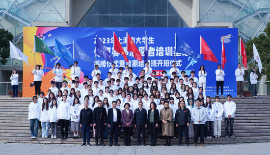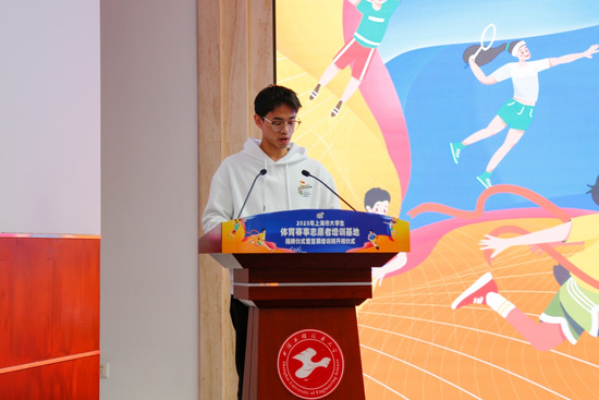 上海市大学生体育协会会长薛明扬与上海工程技术大学党委副书记、副校长朱晓青共同为基地揭牌。薛明扬会长宣布2023年上海市大学生体育赛事志愿者首期培训班开班。