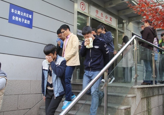 下午13:00,在学生公寓11号楼演练指挥室由学院郑卫副院长宣布:“2016年秋冬季消防演练现在开始”,随着一声令下,整幢楼警铃声阵阵,楼道烟雾弥漫,同学们手拿毛巾掩着嘴、相互提醒、从两边楼道疏散。二楼寝室有同学受伤,一个同学背着受伤同学,其他同学搀扶者一起疏散到底楼,卫生所的葛蓓医生立即对受伤同学进行了救护。通过二、三分钟的时间,11号楼的同学都安全地疏散到了楼外的空地。