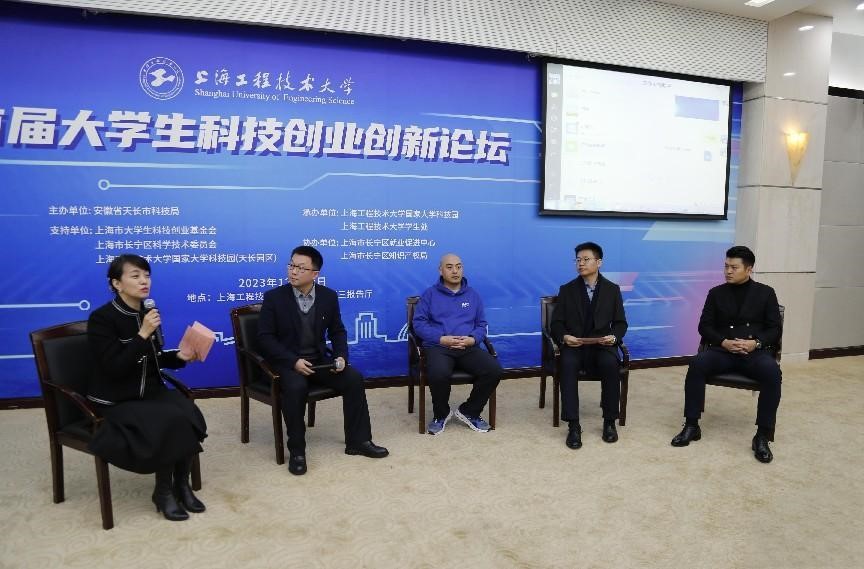 与会嘉宾就大学生创新创业面临的挑战和机遇展开圆桌会谈:上海市长宁区就业促进中心创业指导科科长盛晟就创业政策进行解读;帆书(樊登读书)党支部书记、副总裁安贞灿以科技园孵化企业负责人身份分享了自己的创业经历和项目;北京天下创新专利事务所上海分所(普通合伙)合伙人陈伟贤分享科技类创业项目的知识产权相关注意事项;上海湃通科技有限公司CEO臧伟作为工程大校友、科技园孵化企业分享自己的创业经历和创业规划。