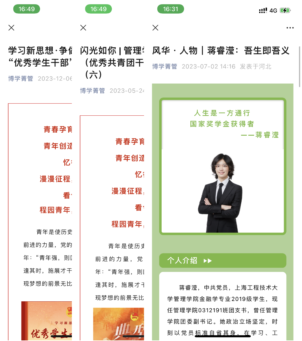 学院通过“博学菁管”公众号中“闪光如你”“学习新思想,争做好青年”“风华·人物”“菁英·博|学子论坛”“带你看看奖学金那些事”等专栏,让学生获得榜样的力量,激励学生树立远大的目标,并得到实际可行的行动方案。