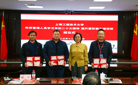 12月15日下午,上海工程技术大学学习贯彻习近平新时代中国特色社会主义思想主题教育系列培训暨2023年科研管理干部培训班结业式在行政楼506举行。副校长许开宇出席结业式并作专题报告。科研处处长、技术转移中心主任谢红主持。组织部(党校)、科研处、培训班全体学员出席结业式。