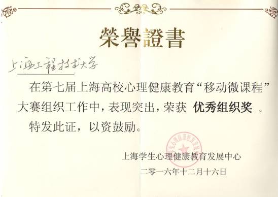 在刚刚举办的第七届上海高校心理心理健康教育移动微课程大赛中,我校获得优秀组织奖。