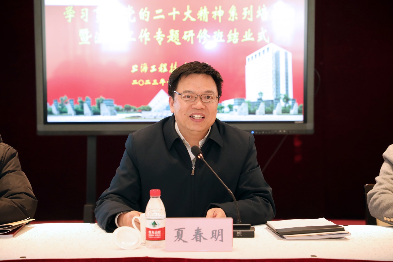 12月21日下午,学习贯彻党的二十大精神系列培训暨法治工作专题研修班结业式在行政楼十九楼举行。夏春明副校长出席会议并讲话,会议由校长办公室主任王佳杰主持。党委组织部副部长、党校常务副校长张可菡,人事处副处长胡建平,校长办公室副主任、合规办主任戴彬及培训班全体学员参加会议。