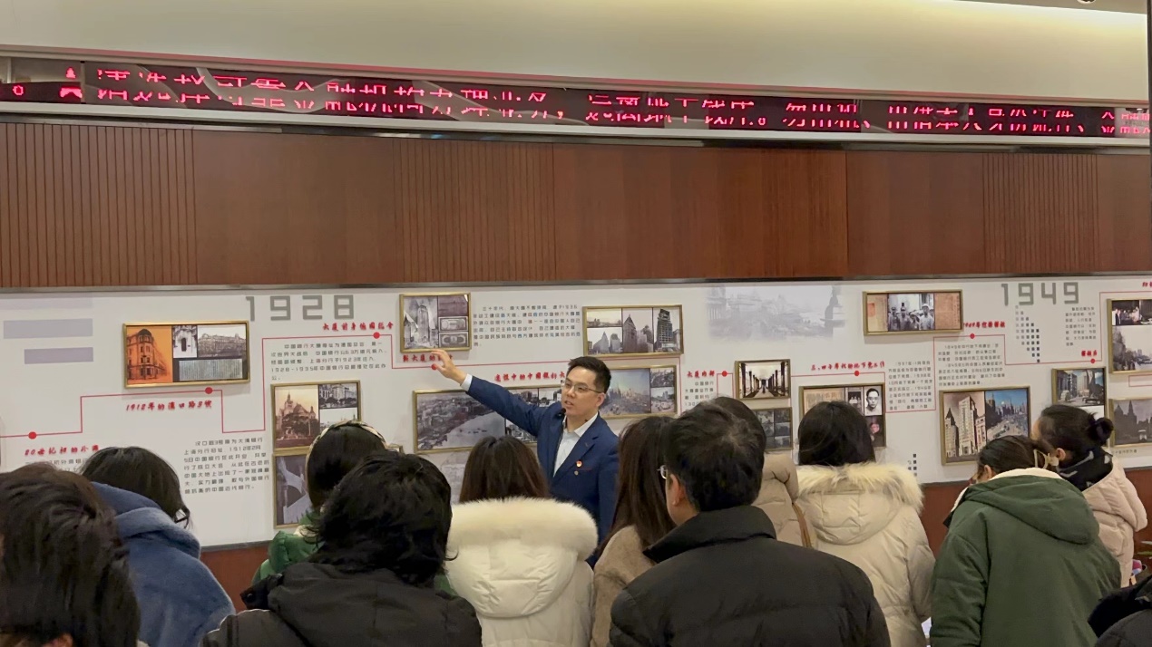 中银财富管理中心党支部党员李骏兵为大家讲述了中国银行的历史变革、发展成就等。党员们集体参观了中国银行大楼、远东第一大厅、历史照片墙、党员之家、观景台等标志性地点。中国银行党支部成立于1938年10月,是上海各大银行中最早成立的党组织之一。在1949年上海解放前夕,中国银行大楼外墙突然亮出两幅30米长的巨幅标语:“庆祝大上海解放”“欢迎中国人民解放军”,这是外滩最早高悬的迎接解放的标语。全行职工在中共地下党领导下,为解放军接收做好了全面的准备。这一切都归功于长期潜伏在中国银行的地下党艰苦卓绝的不懈奋斗。
