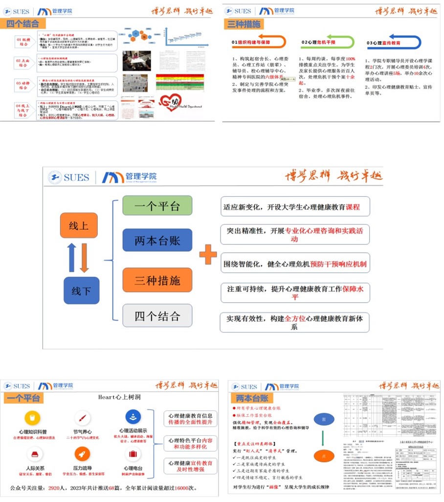 2023年,管理学院深入开展学习贯彻习近平新时代中国特色社会主义思想主题教育,认真落实教育部、上海市教委关于上海学校心理健康教育的要求,在校心理健康教育中心的总体设计和指导下,积极开拓创新,以“12345”工作模式为抓手,深入开展学生心理健康促进行动,提高学生身心健康水平,推动形成“六心”心理育人格局,切实提高心理育人实效。