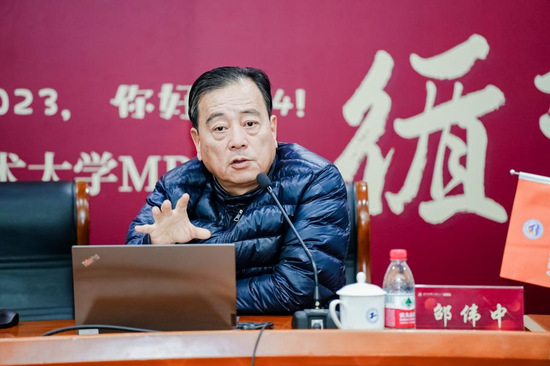 志合越山海,众力铸云程,1月5日,上海工程技术大学MBA年会在长宁校区教学楼101报告厅顺利举办。年会分为MBA高质量发展系列活动、卓越管理论坛和迎新晚会三个环节,上海MBA教指委秘书长许鑫,校客座教授、城市轨道交通现代产业学院院长、原上海申通地铁集团有限公司副总裁邵伟中,管理学院院长、MBA教育中心主任胡斌,管理学院副院长夏志杰出席活动,与MBA教育中心全体老师及首届MBA学生共谱新章。