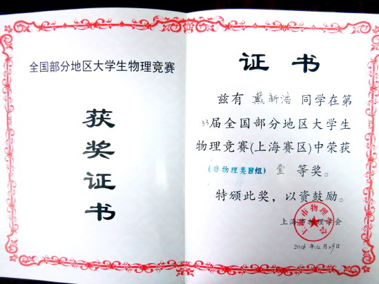 近日,从第33届全国大学生物理竞赛上海赛区组委会传来喜讯,我校参赛学生获得了一个一等奖、五个二等奖、十九个三等奖的好成绩。