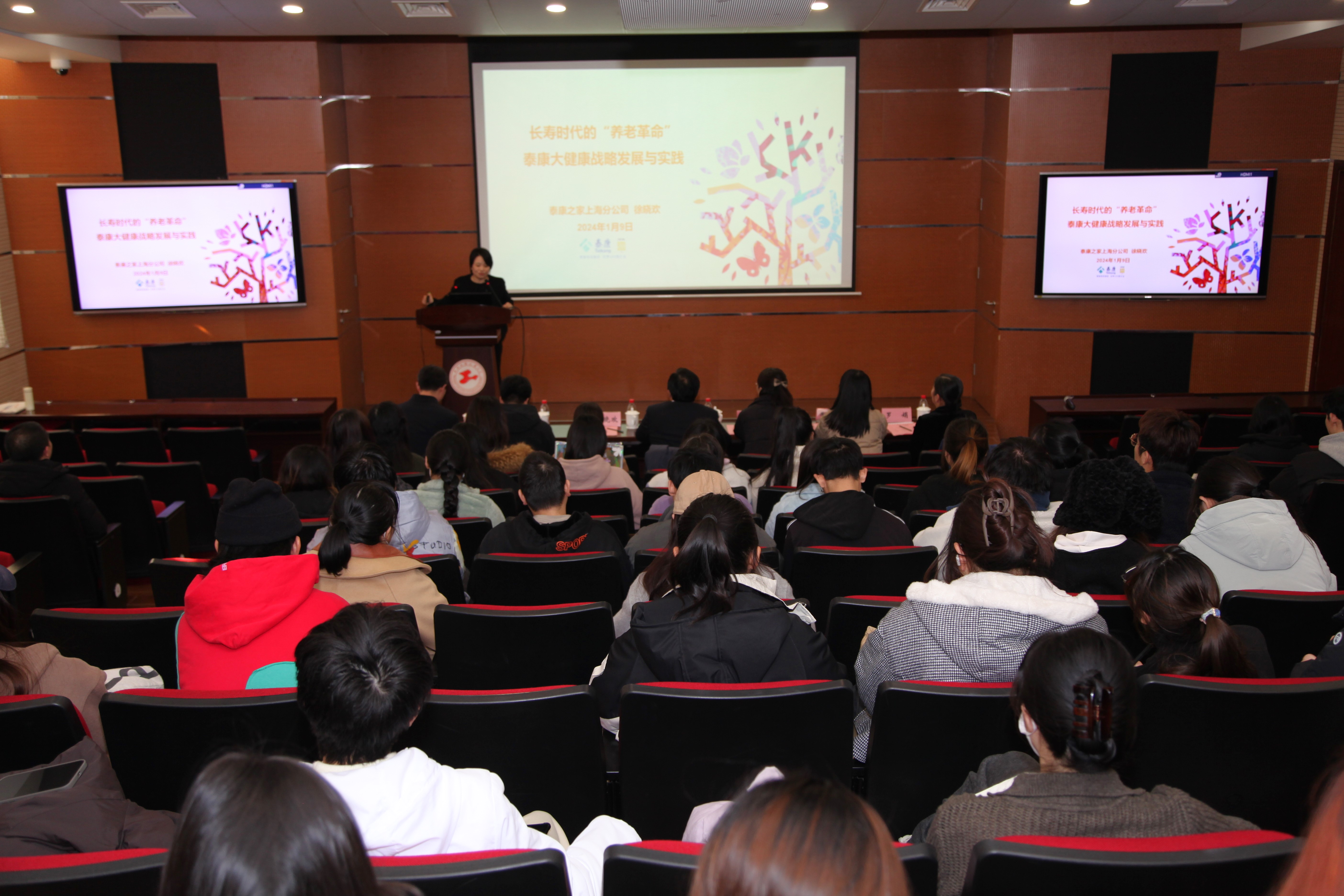 在主题报告环节,徐晓欢在航飞楼报告厅为养老服务管理专业师生作了题为《长寿时代的“养老革命”泰康大健康战略发展与实践》的主题报告。介绍了泰康之家的发展历程、企业战略和价值观,阐述了泰康之家大健康人才发展体系,分享了集团养老服务本土化创新举措,并结合自身经历建议同学们从基层做起,提升专业技能。史健勇副书记鼓励养老服务专业同学深入学习并积极参与养老服务实践,并期待双方合作能够为学生们提供更好的成长平台。