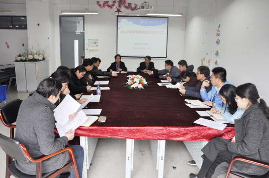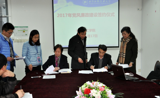 为深入贯彻2017年学校党风廉政建设工作会的会议精神,3月17日下午,化学化工学院在实训楼4403会议室举行2017年党风廉政建设签约仪式,学院领导班子成员、系主任和党支部书记参加会议,会议由学院党总支书记刘宇虹主持。
