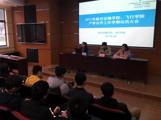 3月20日中午,航空运输学院、飞行学院在航飞楼学术报告厅召开了2017年产学合作教育动员大会。学院副院长姚红光出席会议,2016级航空经营管理、空中乘务、民航运输专业的同学参加了此次大会。会议由学办主任赵梦影主持。