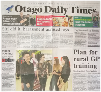 从上海到达尼丁,代表团一行历经了两次航班延误导致的时长48小时的长途跋涉,并在踏上达尼丁的土地后立马进入到工作状态。由于计划被打乱,领队老师及时进行了应急处理,与新西兰方沟通,压缩休息时间,确定最新时间表;而模特学生们则顾不得把行李安置进酒店,第一时间被ID时装周组委会的工作人员从机场接到品牌处开始高强度工作;中法学院的学生则很好的起到了辅助作用,让他们工作起来无后顾之忧。当晚,代表团一起参与了本次ID时装周的开幕酒会,师生们与会场设计师以及相关专业人士侃侃交流,并在现场参与了一个名为“市民造型秀”的活动,该活动旨在将T台上高高在上的服装引入到平民生活中,而中法的师生也通过现场搭配造型,很好的诠释了主办方提供的互动服装。现场模特们的身影被摄影师捕捉,登上了Otago Daily Times报纸的首页。
