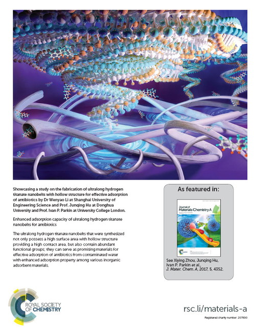 近日,我校材料工程学院李文尧副教授等与东华大学胡俊青教授、英国伦敦大学(UCL)Ivan P. Parkin教授合作,就无机纳米材料处理污水中的抗生素取得最新研究成果,在材料科学领域英国皇家化学会国际知名杂志《Journal of Materials Chemistry A》(影响因子8.262)上以“Enhanced adsorption capacity of ultralong hydrogen titanate nanobelts for antibiotics”为题发表,并入选该杂志内封面(Inside Back Cover)文章,而且在该杂志封底作为亮点文章(Highlight)进行了报道,有望为材料工程学院ESI高被引论文添砖加瓦。