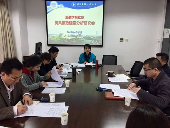 4月10日上午,服装学院党委在艺术楼A218召开2017年党风廉政建设分析研究会。服装学院党政领导班子出席了会议,会议由服装学院党委书记袁蓉主持。