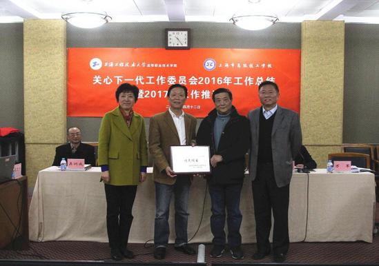 学院党委副书记、关工委副主任田盈耕宣读《关于调整高职学院、高级技校关工委成员的通知》。党委书记沈海庆,院长胡宁一同为新一轮关工委成员颁发《聘书》,并为关工委“青蓝工程”项目颁发《市教育系统关工委中职分会授予的特色项目奖》。接下来,关工委常务副主任杨君伟老师作《2016年关工委工作总结暨2017年工作计划》汇报,他从学习引领凝聚共识、“阳光导航”项目引领、总结经验继续前行、工作设想着力落实四个方面入手细致地总结了关工委2016年整体工作完成情况,并有计划地对2017年关工委工作提出了设想。关工委委员、虹口区未成年人保护办公室主任陈再跃,关工委委员、江湾派出所副所长汤晓青,关工委委员、江湾镇街道社区文化中心主任、党校讲师团成员陈献安,关工委委员、青蓝带教项目导师代表陈竹君分别总各自工作角度谈了自己的想法。