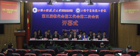副校长鲁嘉华在开幕式上发表讲话。他充分肯定了高职学院坚持每年召开二级教代会和工代会,不断加强基层民主政治建设,规范和完善二级学院教代会制度的工作实效。同时,鲁嘉华副校长对近年来高职学院在全面贯彻党的全会精神及习近平总书记重要讲话精神,主动适应国家加快发展现代职业教育和实施“中国制造2025”战略方面所取得的一系列成绩表示祝贺。他在大会上鼓励学院全体教职工以高度的责任感、使命感和主人翁意识克服困难,强化创新驱动,努力建设好高层次衔接的现代职业教育体系、高素质技术技能人才成长体系和高品质校园文化创新体系,支撑现代工程技术应用型人才培养。